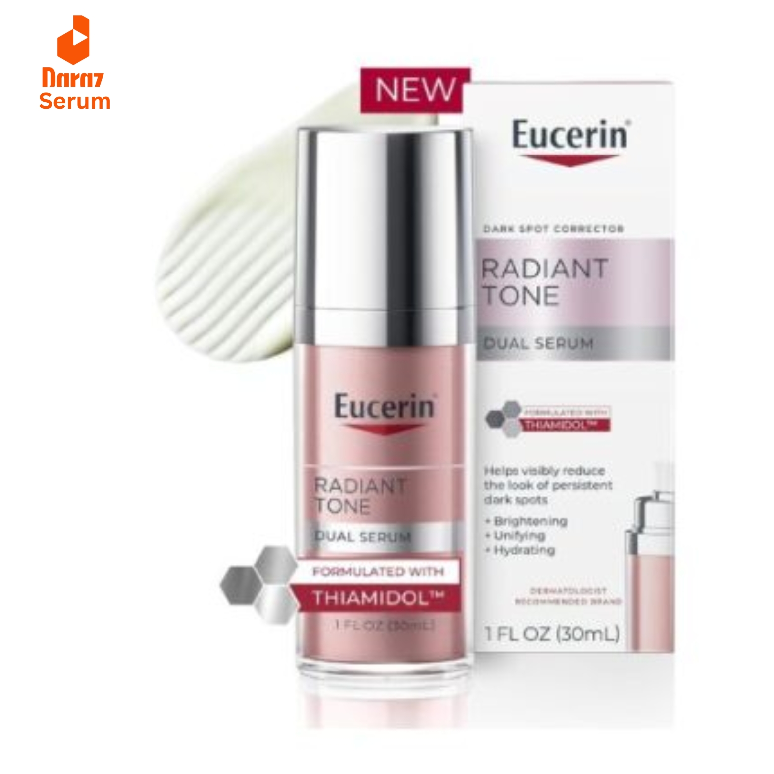 INCLUDES: One 1 fluid ounce bottle of Eucerin Radiant Tone Dual Serum, Dark Spot Corrector Serum With Thiamidol and Hyaluronic Acid