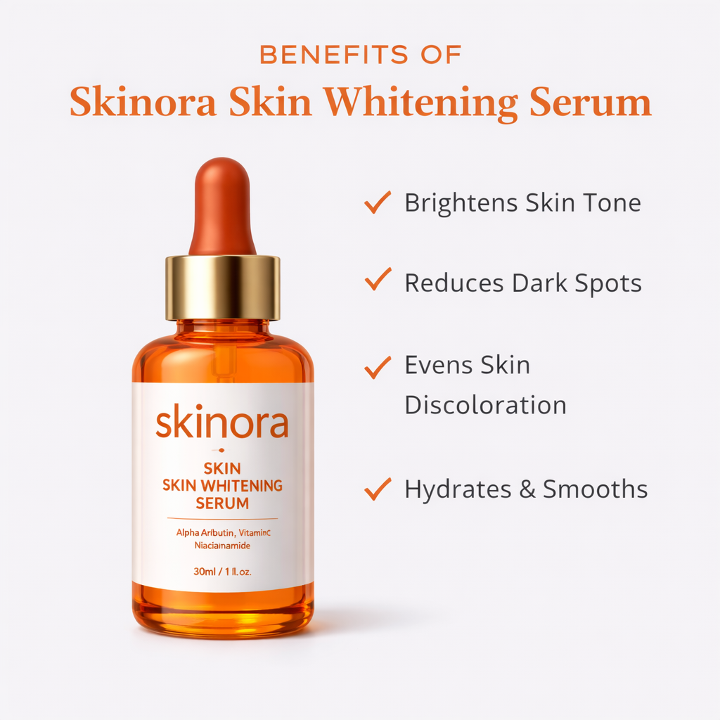 Skinora whitenings serum helps brighten the skin, reduce dark spots and improve overall skin tone for a clearer and more radiant look.